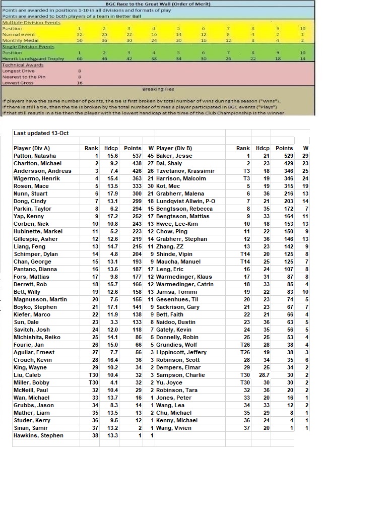 Points are awarded in positions 1-10 in all divisions and formats of play. Points are awarded to both player of a team in Better Ball. Scrambles do not acquire points.
