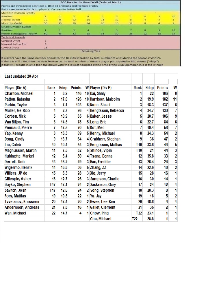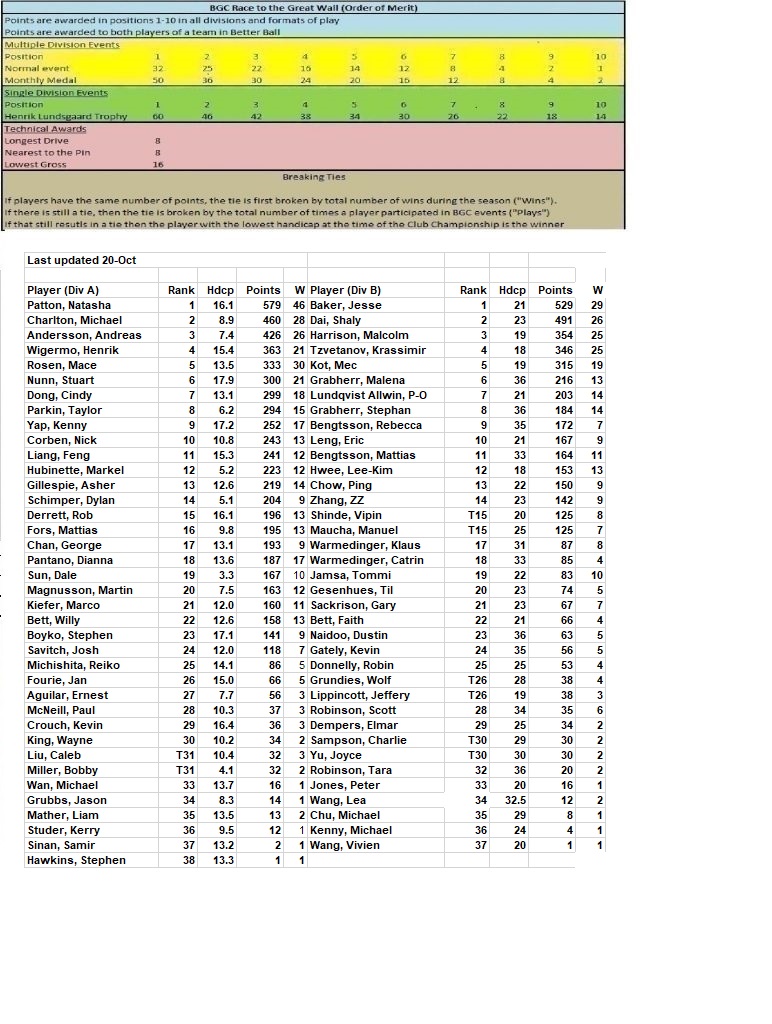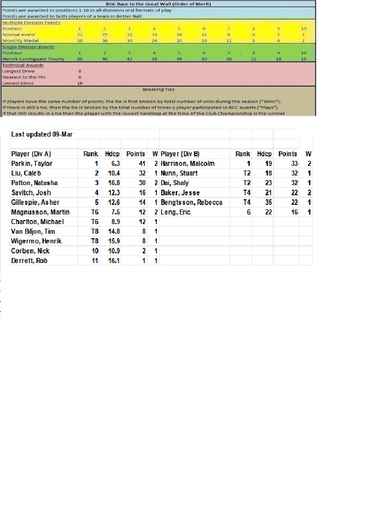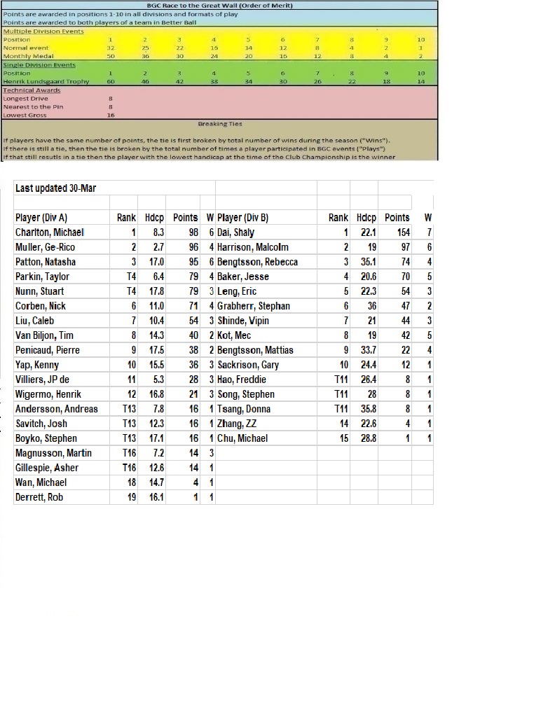 Points are awarded in positions 1-10 in all divisions and formats of play. Points are awarded to both player of a team in Better Ball. Scrambles do not acquire points.